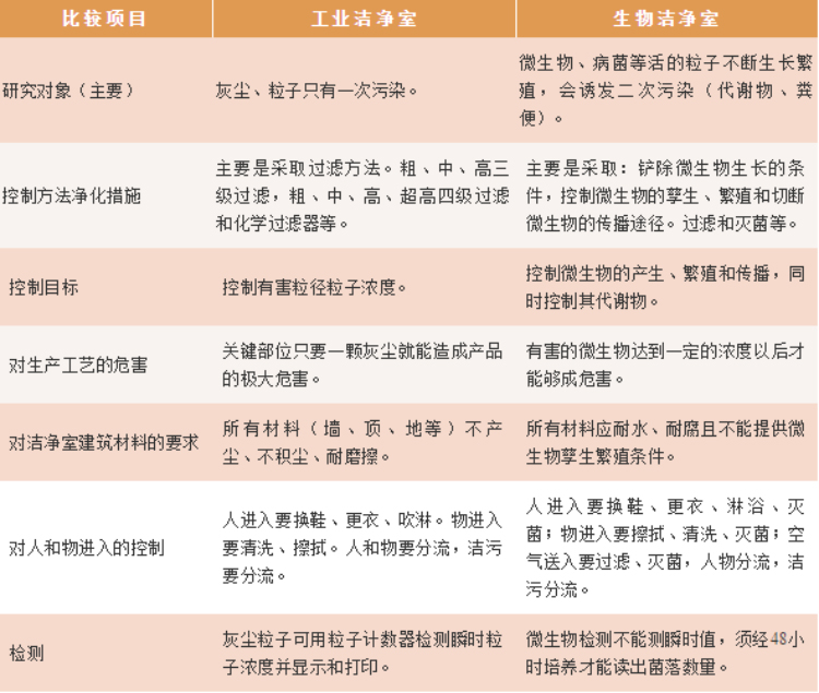 不同行业的洁净室有着不同的区别,例如工业洁净室与生物洁净室: