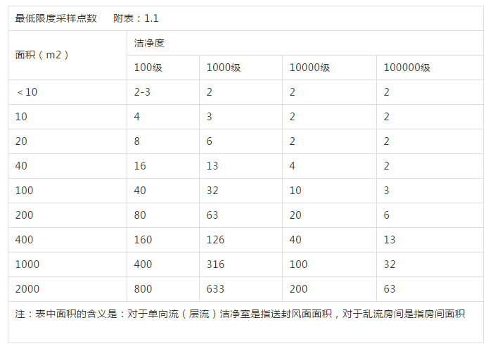测定洁净度的最低限度采样点数按附表1.1的规定确定;每点采样次数不少于3次,各点采样次数可以不同;条件:风量、正压调完,室内按要求进行清洁打扫、生物洁净室应按要求消毒,足够的预净(空吹)时间。最多二人穿洁净服进入,且尽量在下风向。