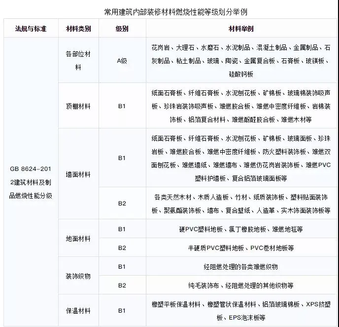 我国的建筑建材的应用须遵照1984年颁布实施的“中华人民共和国消防条例”。在实际应用中,材料的性能要求及应用范围还应依据具体的相关法律法规,如:《建筑设计防火规范》GB50016-2014,《高层民用建筑设计防火规范》GB 50045-2005,《建筑内部装修设计防火规范》GB50222-2017等。
