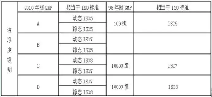 98年版与2010年版GMP洁净室各级空气悬浮粒子标准对照:
