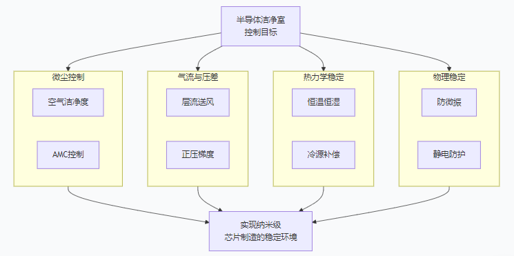 半导体洁净室的稳定运行依赖于对以下四个关键参数的极致控制,其相互关系如下图所示: